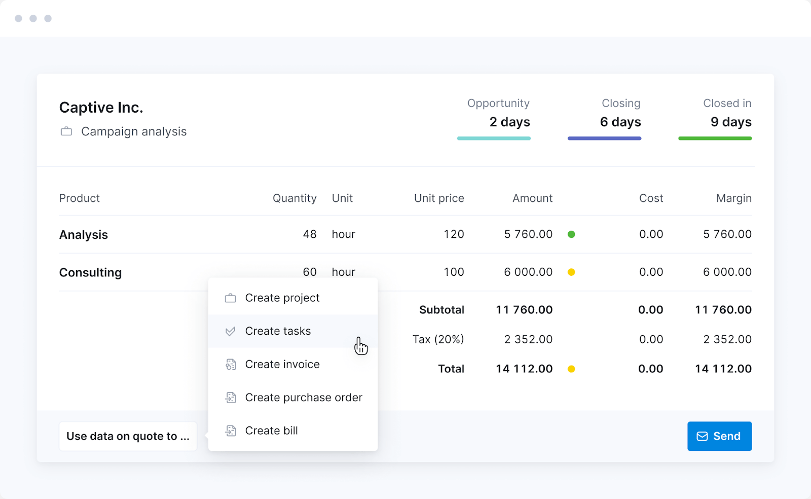So, when a Salesforce lead becomes a confirmed “Opportunity,” all the relevant customer and project details populate a new Scoro quote. This speeds up your quoting and project planning processes. And gives you an accurate foundation to work from.