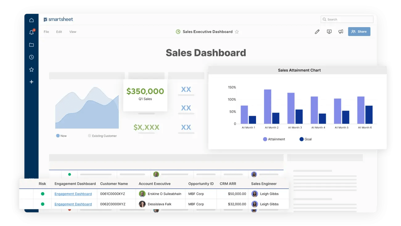 For example, you can build a dashboard combining project execution metrics such as task completion rates (tracked in Smartsheet) with client data like account value (pulled from Salesforce).