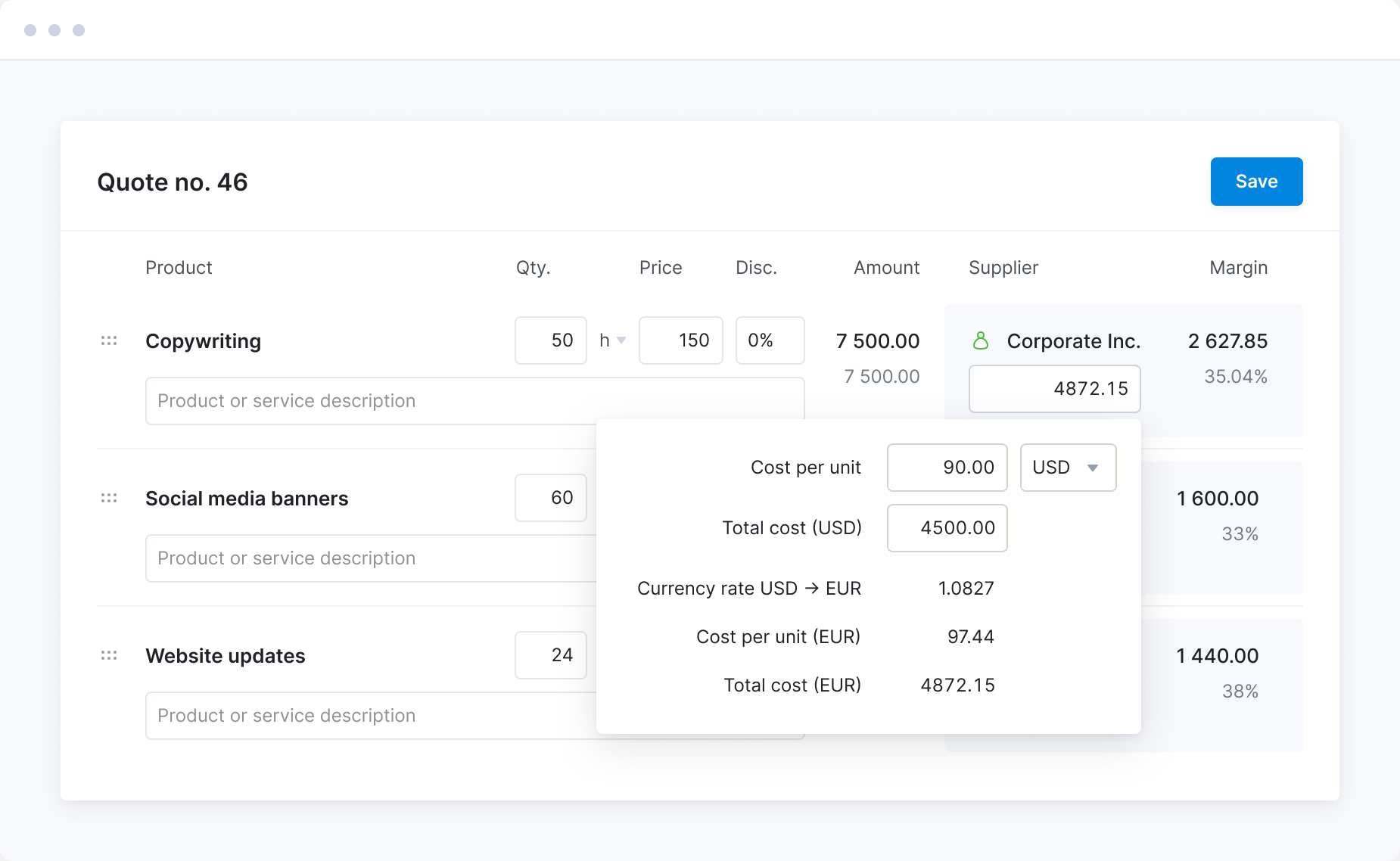 Scoro handles multiple currencies within a single project, with automatic FX rate updates and margin calculations that account for cross-currency costs natively. Every invoice type works across all currencies without workarounds.