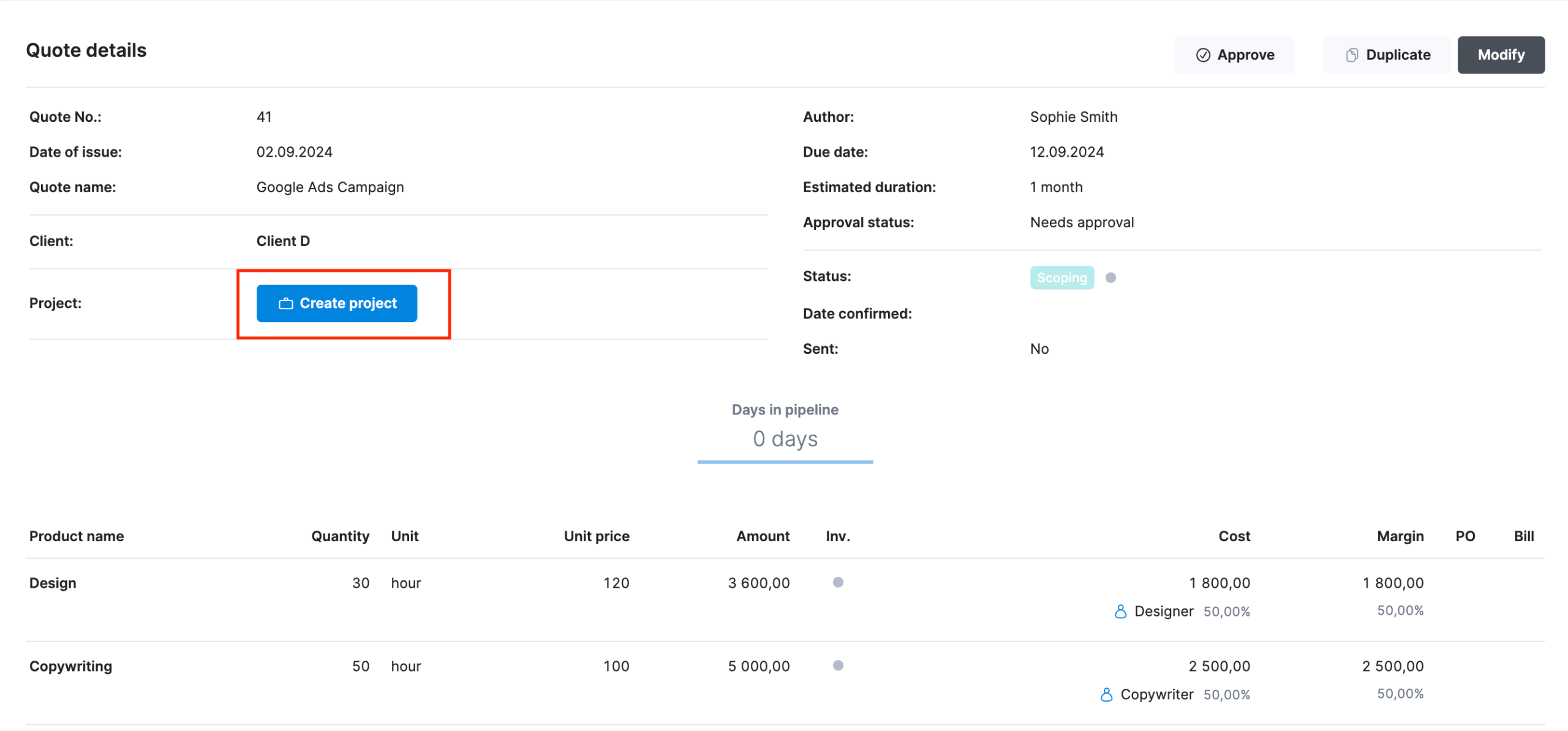 In Scoro, take your quote and click the “Create project” button to convert it into a project.