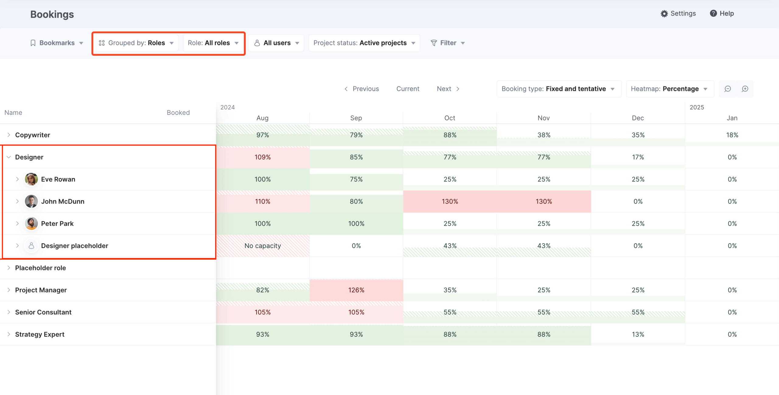 Expand the role you need to assess (e.g., Designer) to see who’s at or over capacity versus who still has bandwidth.
