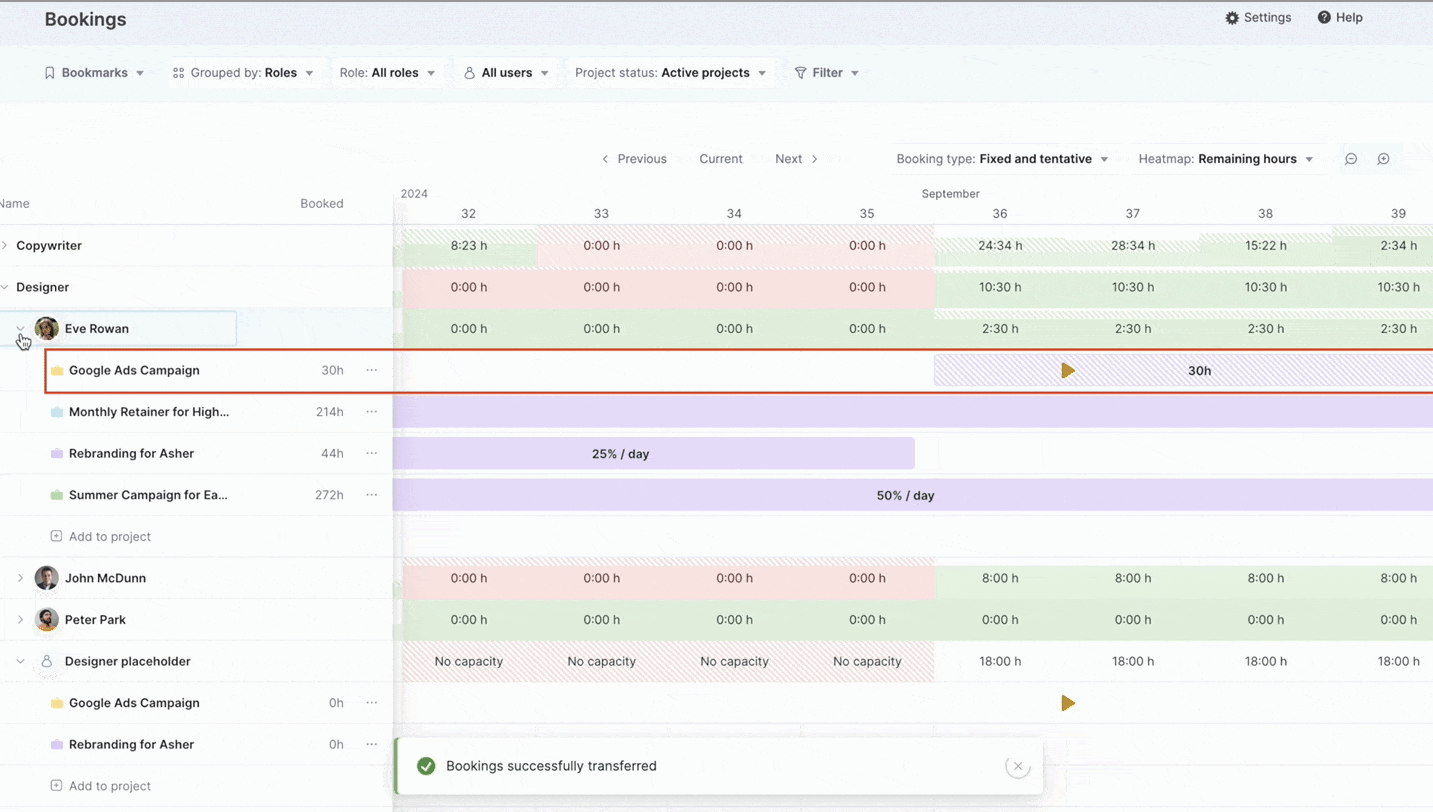 From here, you can simply transfer the placeholder booking to Eve. Locking in a realistic plan without overloading anyone.