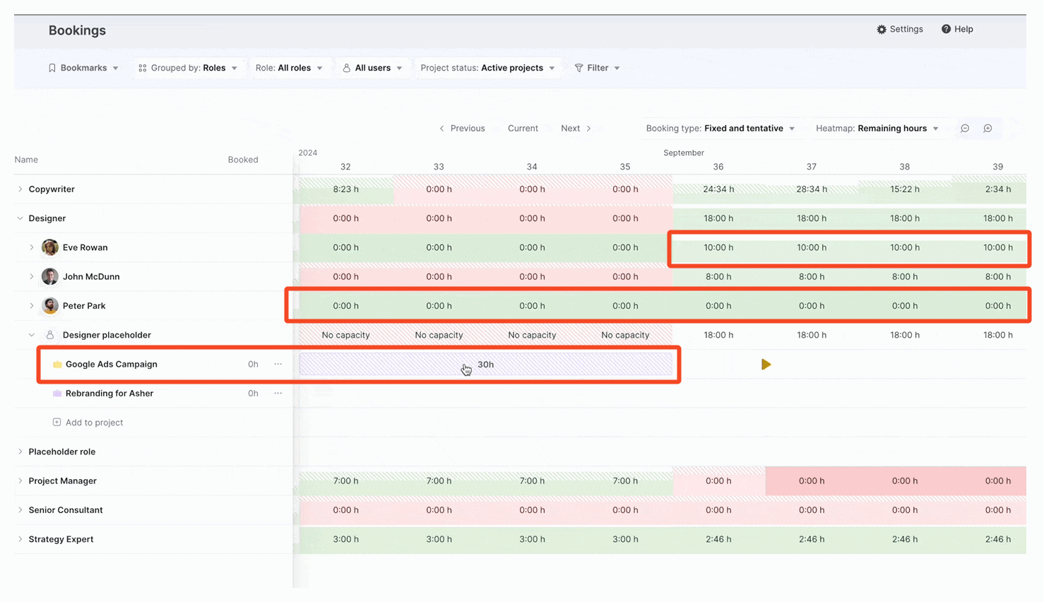 In the example below, Peter is fully booked; Eve and John still have capacity. Eve shows ~10h available each week in September, making her a good fit for the Google Ads Campaign project we just converted from the quote.
