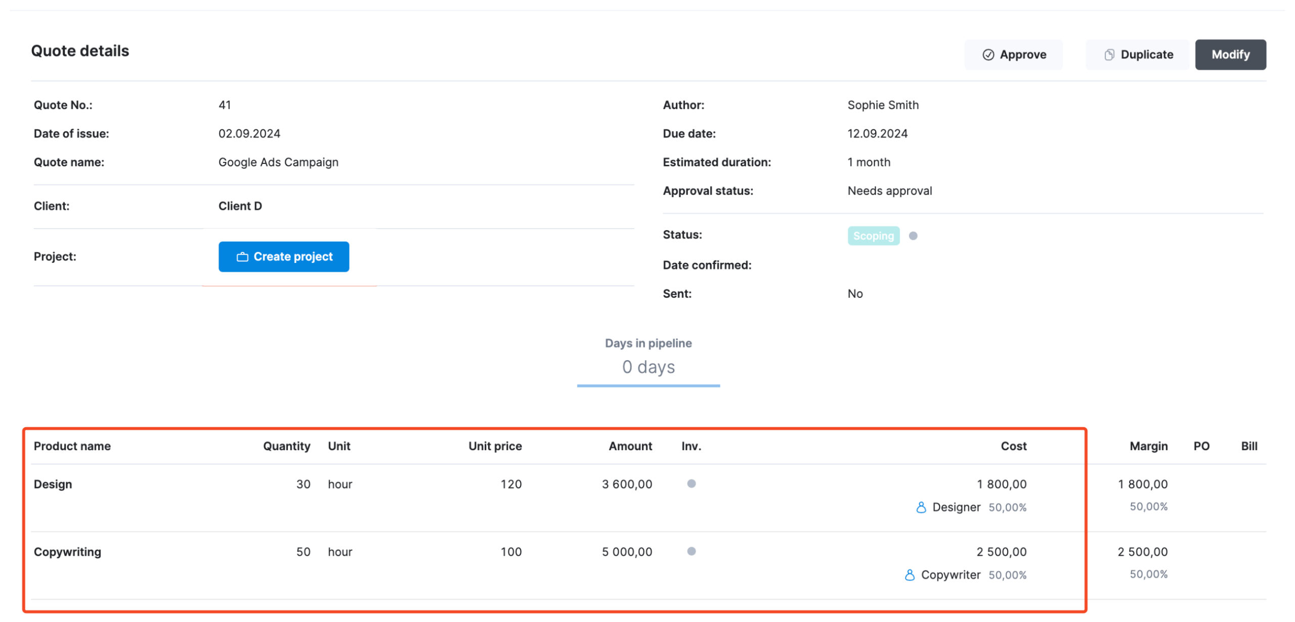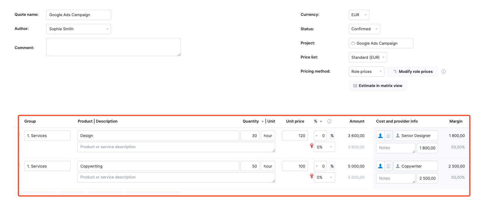 And with Scoro’s matrix quoting, a single deliverable can be split across multiple roles behind the scenes.