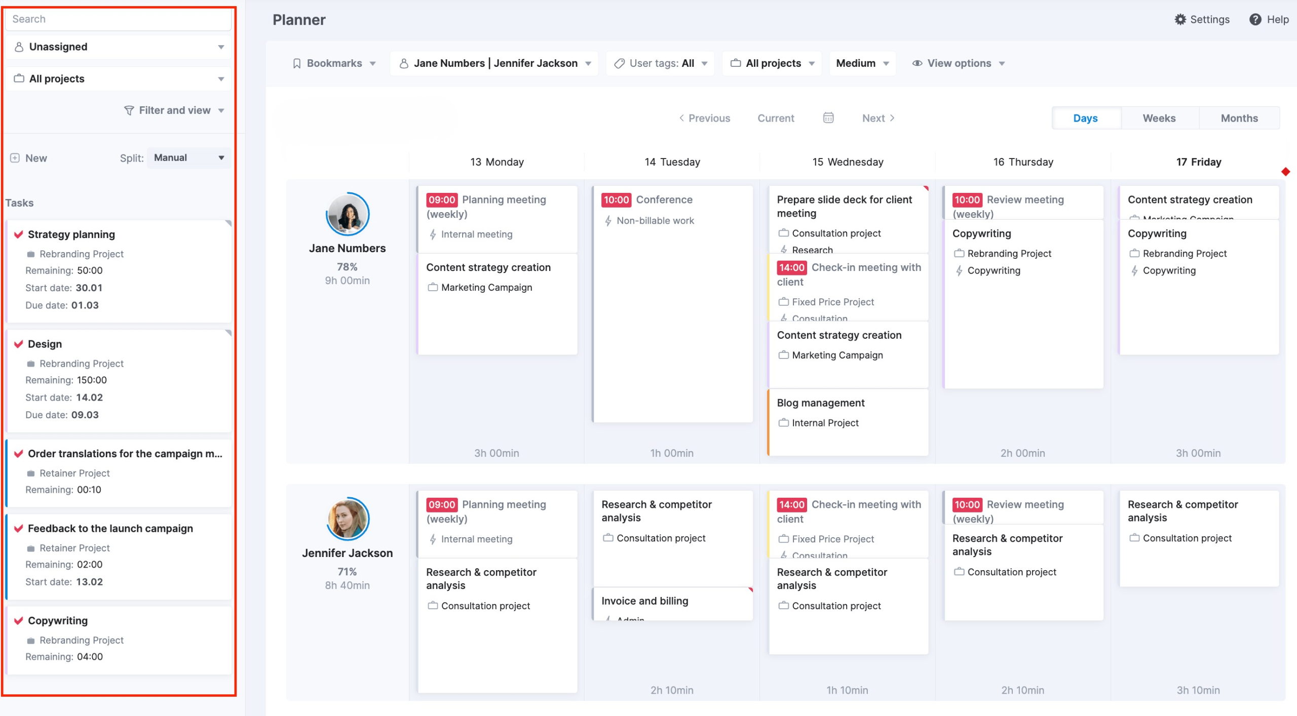 For more granular resource planning, use Scoro’s “Planner.” It’s helpful for planning daily work, scheduling tasks, and tracking utilization.