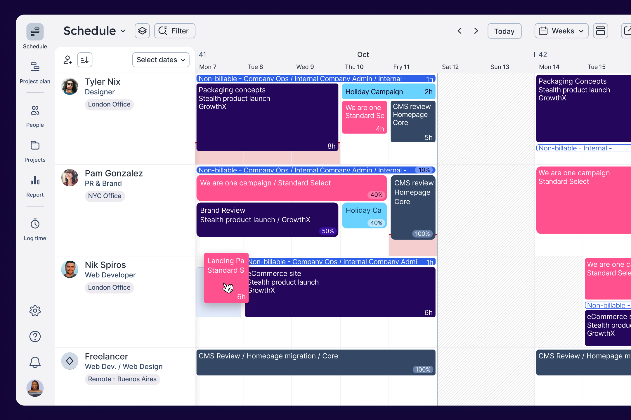 - Real-time visual scheduler: A color-coded timeline shows exactly who’s doing what. Drag tasks around and the changes instantly appear for everyone — helpful for agencies that adjust plans multiple times a week.