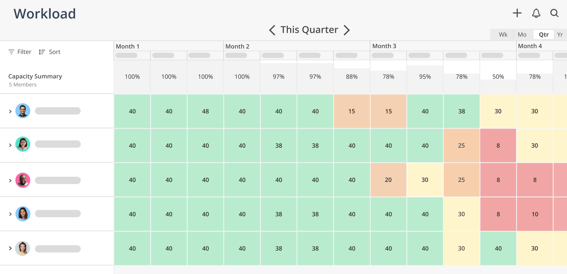 - Utilization heatmaps: Visual, color-coded grids that show availability across the next week, month, or 6 months. Highlight burnout risks and bench time instantly.