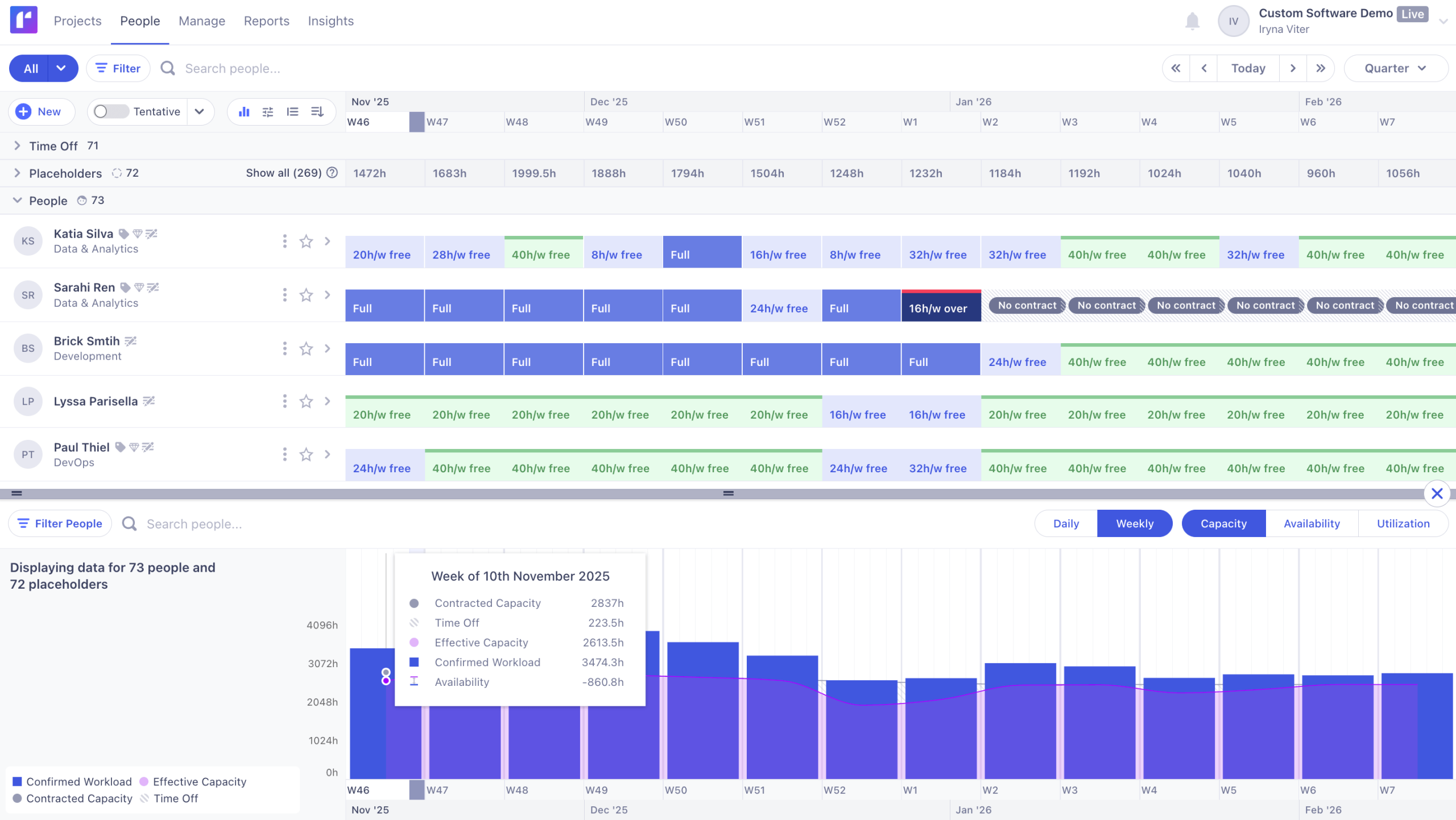 - Reality-Proof Capacity View: Instantly spot who is overbooked or underutilized with a clear view of actual availability that accounts for time off and holidays.