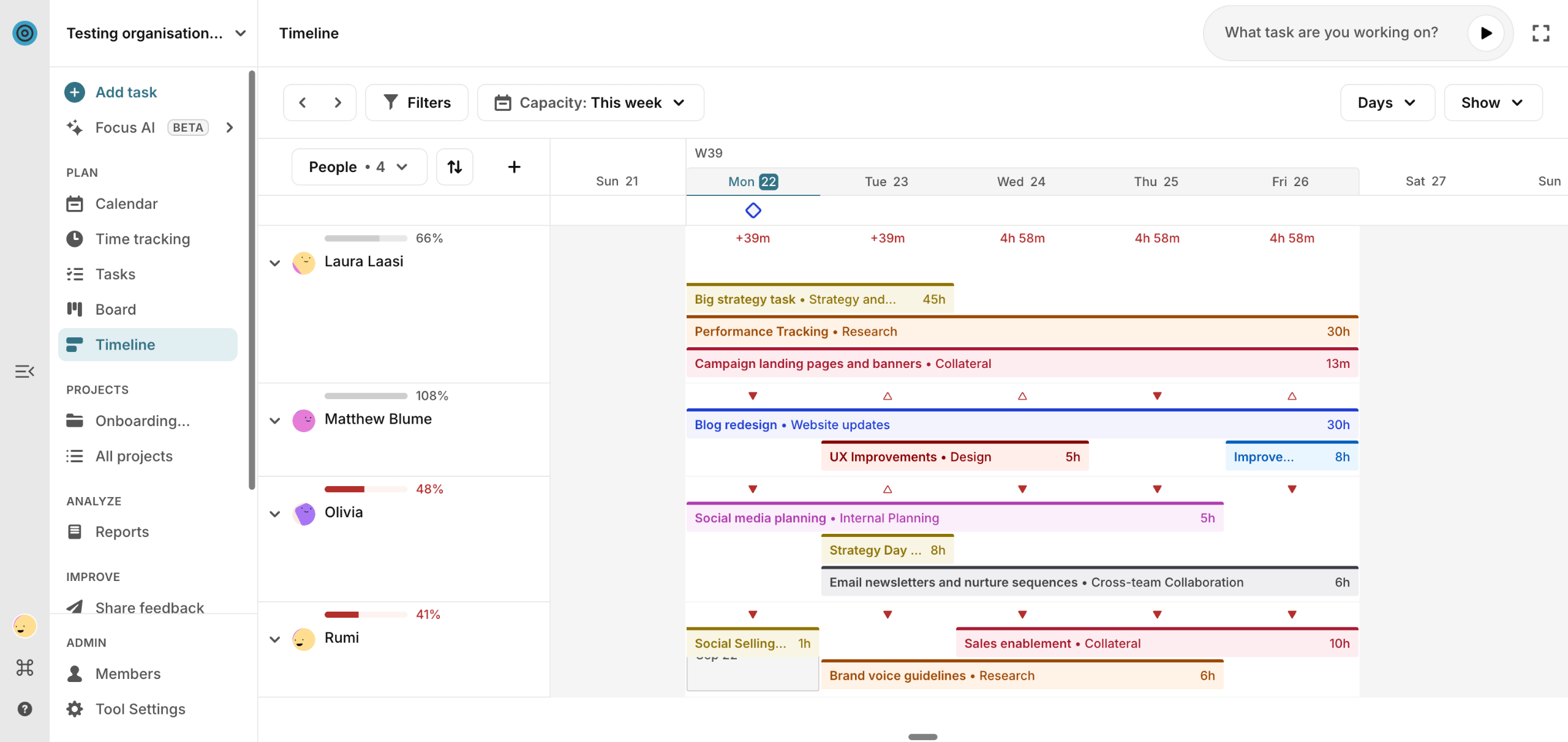 - Workload planner: Schedule specific projects and tasks within a calendar-like view to identify granular work conflicts in real time