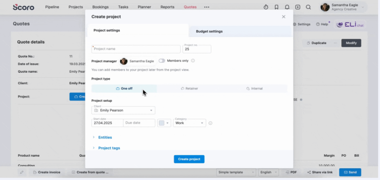 | Scoro | Mid-sized to large consultancies needing one system for CRM, projects, and financials | Connects sales to delivery with automated “Proposal → Project” flow; detailed quoting and margin visibility from the start | From $37/user/month |