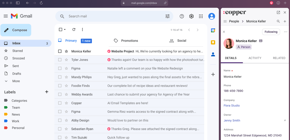 Copper gets its CRM data straight from your Gmail inbox or calendar, so there’s less manual data entry. And everything’s right where you need it—no switching tabs and trying to find the right data.