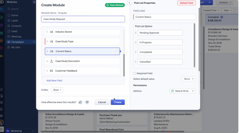 And when testing, we appreciated the “Modules” that let you design custom actions. Like “manage case studies requests from the sales team” or “track marketing campaigns on new leads.”