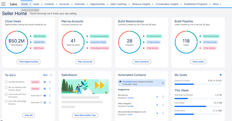 Salesforce’s “Seller Home” consolidates CRM data and offers custom activities for your day, helping you quickly prioritize work.