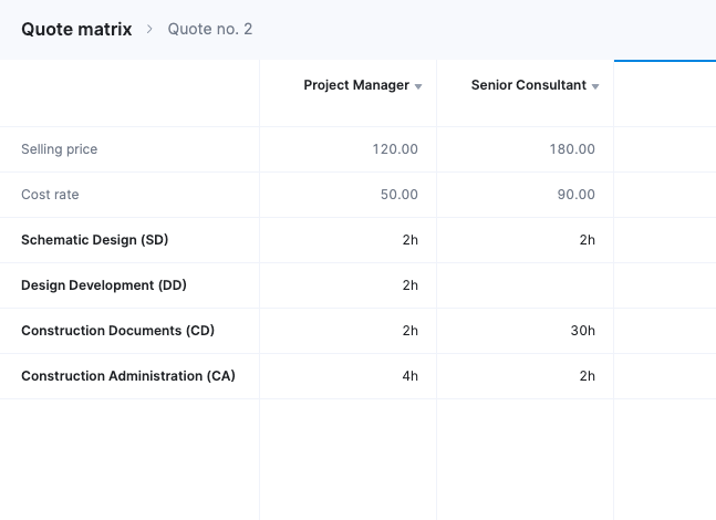For example, using the matrix style quoting you can add multiple roles per phase or task to reflect who’s actually doing the work and what each role costs.