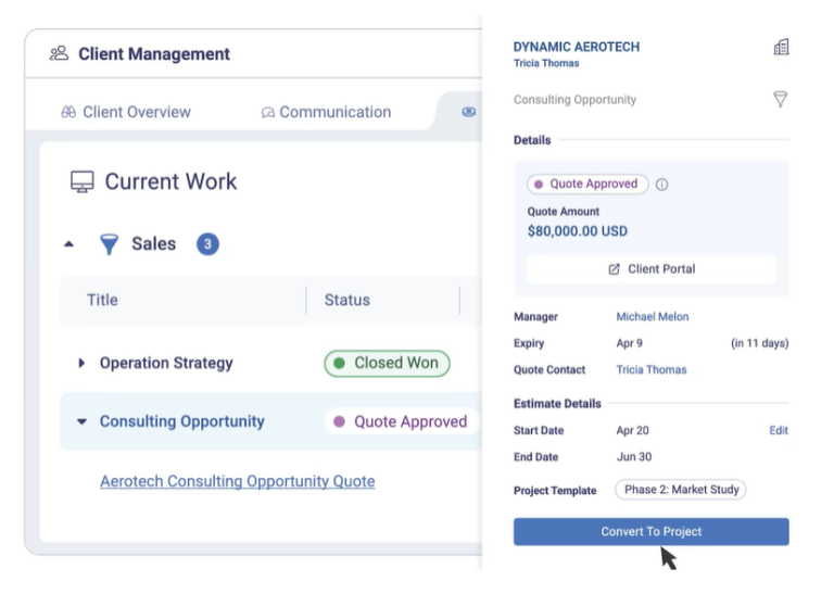 Once a deal closes, your client data, project scope, and budget info automatically transfer to a clear project plan and invoice. This helps you hit the ground running and keeps sales, delivery, and ops teams aligned.