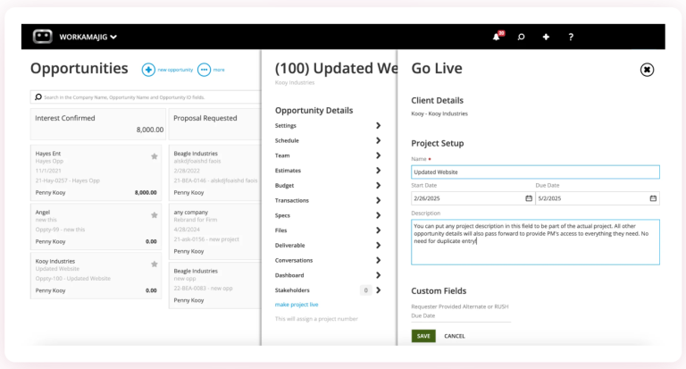 Workamajig’s CRM lets you capture conversations, track deals through stages, and move opportunities through your pipeline with a drag-and-drop design. When opportunities close, they automatically convert into projects with all client information, estimates, and project details carried over.