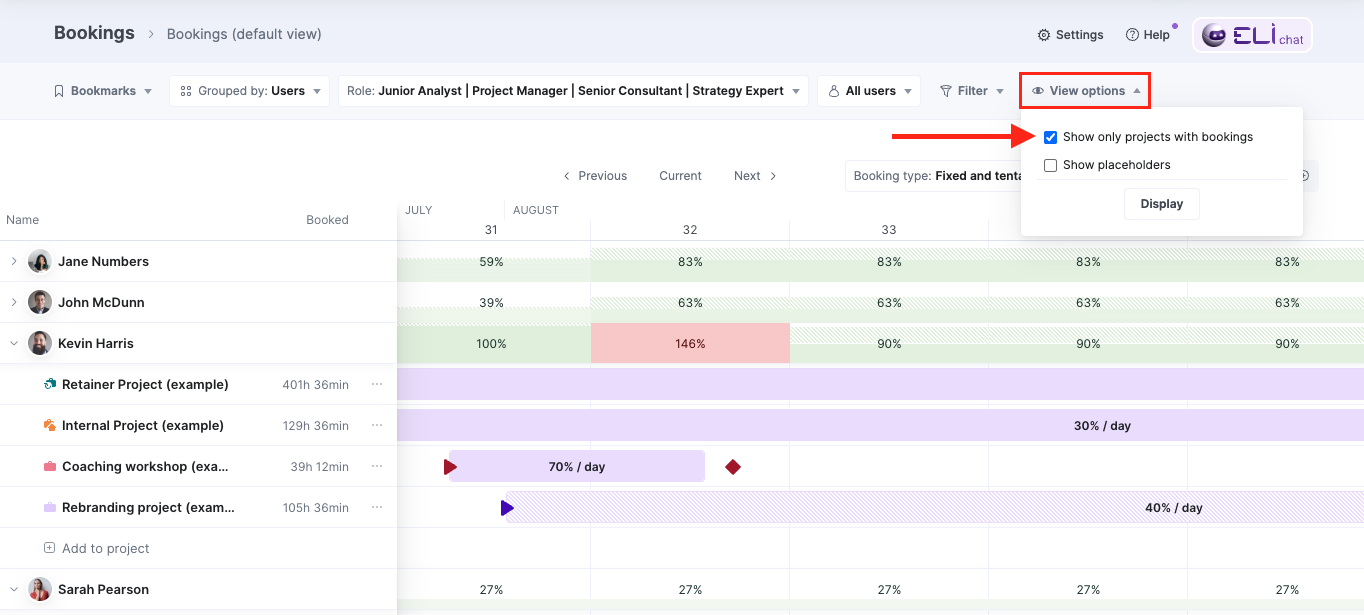 If you’re using the Bookings module for short-term monitoring of your active project portfolio, you can now hide projects without bookings to instantly declutter the view of rows where no team members are booked during the time frame you’re viewing. This makes it significantly easier for specialists and project managers to analyze workloads and check for conflicts.