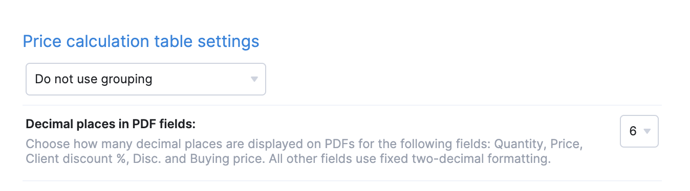 You can now limit how many decimal places are shown for the Quantity, Price, Client discount, Discount, and Buying price values on your PDF documents. Simply modify your template, go to the Price calculation table tab, and choose the number of decimal places to display from the Decimal places in PDF fields dropdown. This ensures the values on your outgoing PDFs have a clean, consistent look.