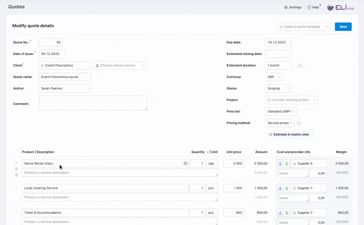 To do this, simply add your outsourced service or product to your quote and select the necessary currency for the costs from the dropdown field. You’ll also see the currency exchange rate details.