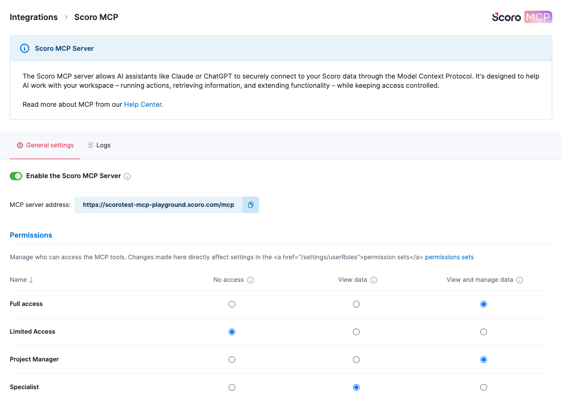 To enable this for your team, navigate to Settings > Site settings > Integrations > Scoro MCP to activate the organization-level toggle and configure user permissions. Detailed configuration guides, as well as information on tools and data security, are available in our Help Center.