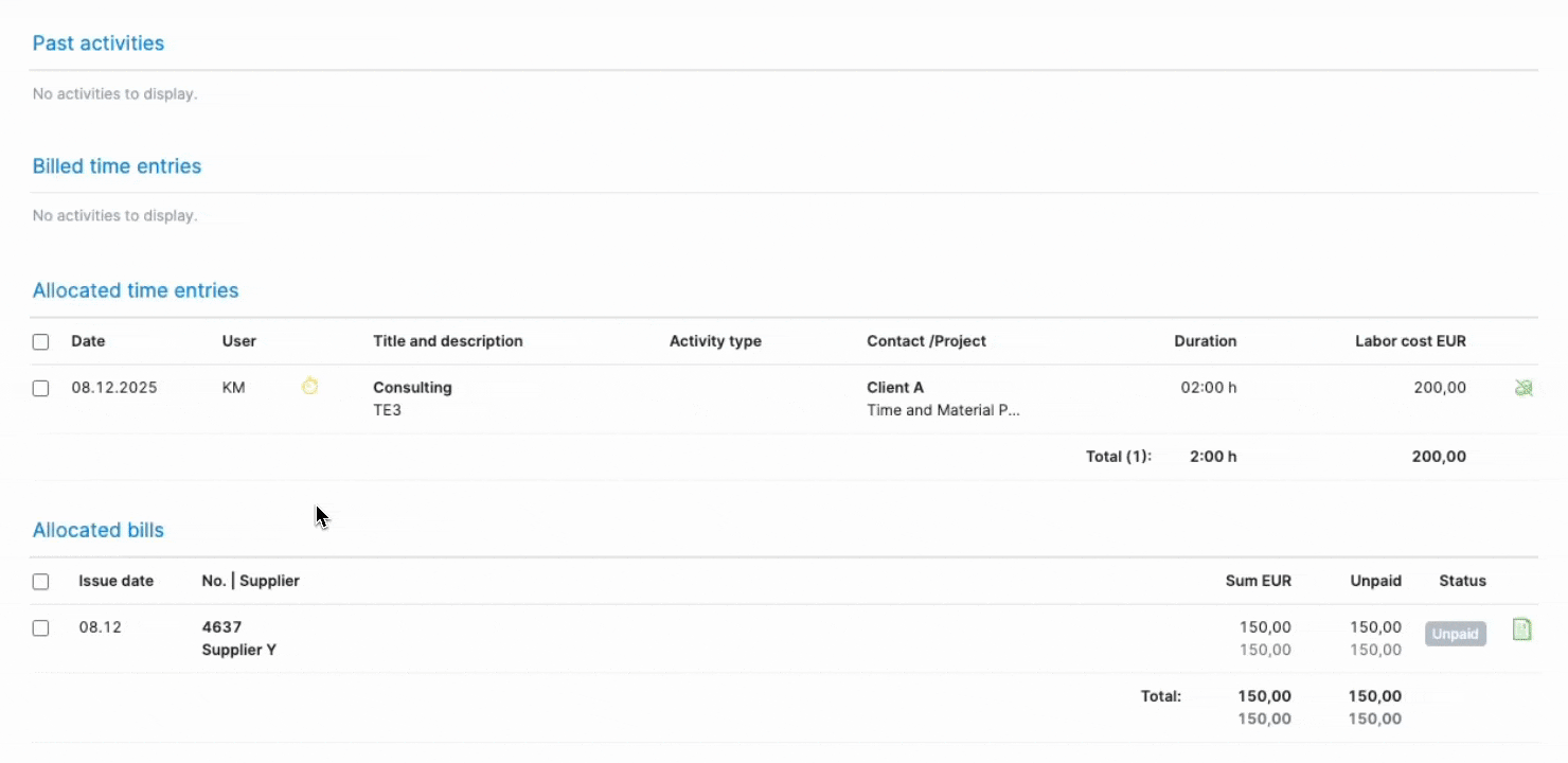 Now, you can also unlink the allocated items from the invoice detailed view to correct an accidental allocation or reallocate them to a different invoice, ensuring your financial records are always accurate. Simply select the necessary items in the section listing the allocated time entries, bills, or expenses, and click the Unlink from invoice button.