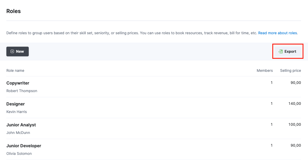 Roles are a core part of Scoro, serving as the foundation for accurate resource planning, pricing, and reporting. To help you manage your site roles more efficiently – like updating the selling prices across many roles at once – you can now export your entire roles list directly from the roles settings page. Simply click the Export button under Settings > Sales and finance > Roles and choose between a CSV or XLS file format.
