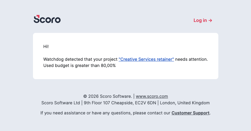 If you manage recurring client work, you can now set up watchdogs for retainer metrics. Simply set the threshold for when you want to be notified, and let Scoro handle the tracking in the background.