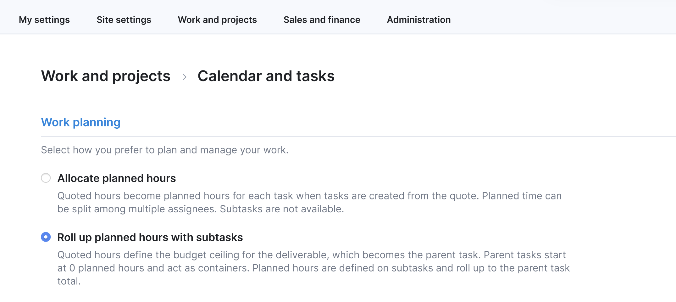 While subtasks add more flexibility, using them is optional. To support different workflows, we are introducing work planning methods that define how your budget and plan interact on your site, allowing you to choose the logic that best fits your team.