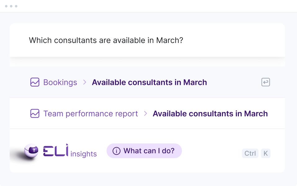 Scoro AI comes to life through ELI – your smart companion, built into Scoro. Powered by AI and Scoro’s advanced data engine, ELI understands natural language, interprets complex business data, and helps you take action fast.