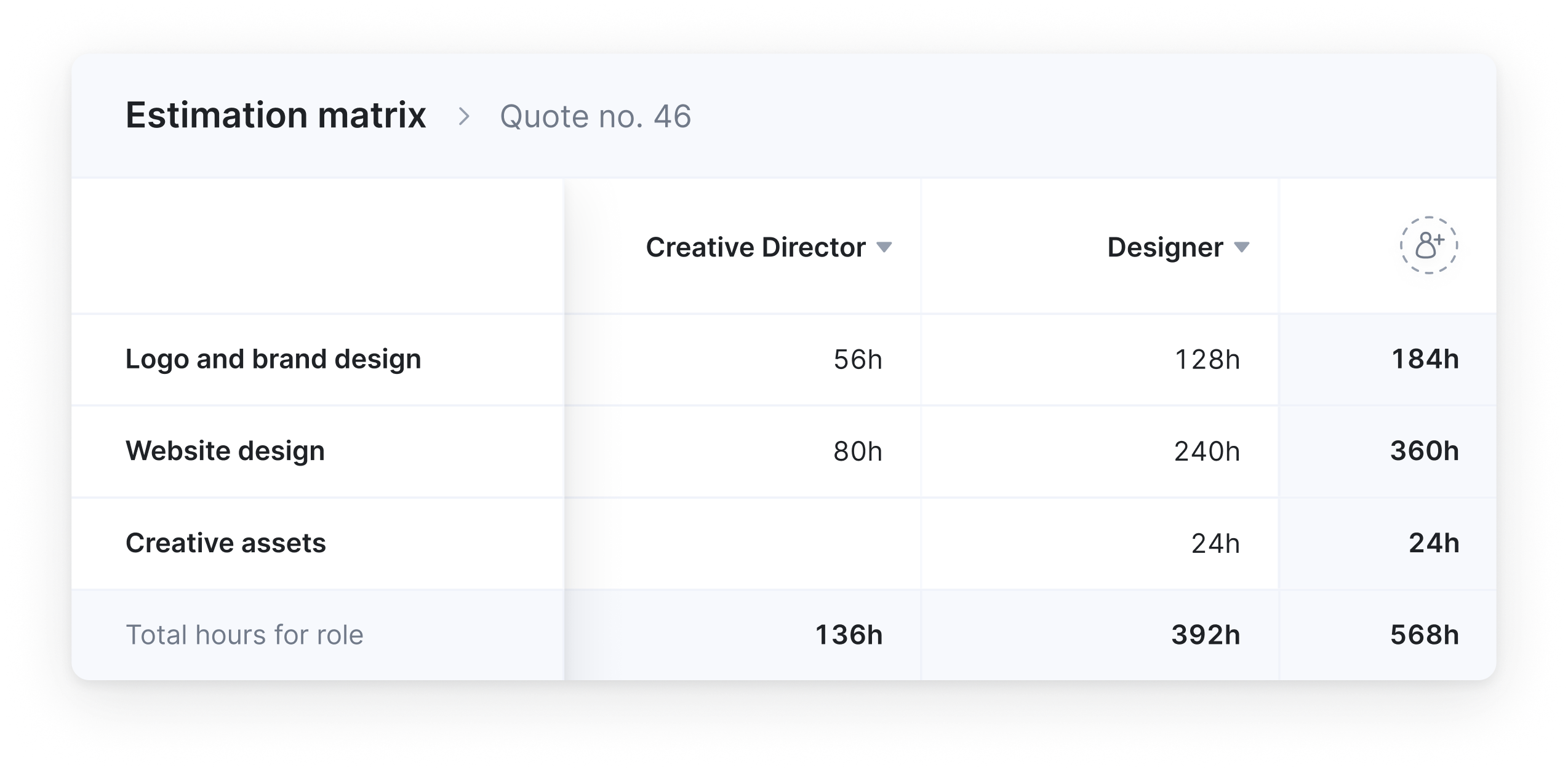 When your projects involve multiple roles contributing to the same deliverable, Scoro’s estimation matrix lets you easily plan effort, cost, and price in one clear view. Most PSA tools, including Productive, don’t support this natively, forcing teams to patch quotes together in spreadsheets.