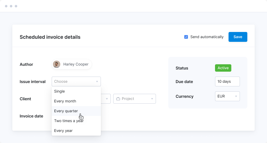 Scoro offers an automatic sending of scheduled invoices