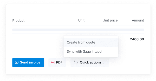 Eliminate the need to send manual reports to your accounting team to explain what to invoice and when. Generate invoices directly in Scoro based on confirmed quotes or logged time and incurred expenses. Send them out to clients right away with little effort.